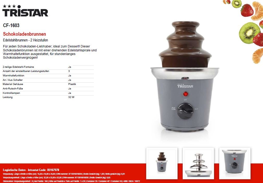 Tristar Edelstahl Schokobrunnen/ Schokofondue – mit Warmhaltefunktion/32 Watt Leistung, CF-1603